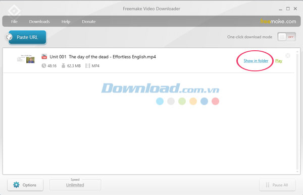 Sau khi hoàn tất, nhấn chuột vào tùy chọn Show in Folder để mở thư mục chứa video được tải về.