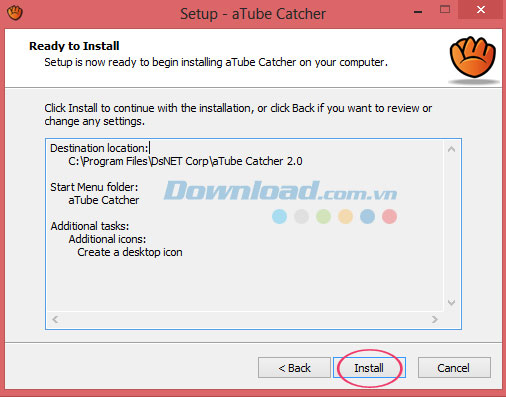 Và chuẩn bị để cài đặt aTube Catcher trên máy tính. Nhấn Install để tiếp tục việc cài hoặc chọn Back khi cần xem xét hoặc thay đổi một số cài đặt.