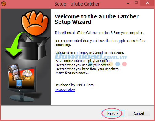 Và bạn sẽ nhìn thấy một trình thuật sĩ hướng dẫn cài đặt aTube Catcher trên máy tính của mình. Người dùng được khuyến khích nên đóng tất cả ứng dụng khác trước khi tiếp tục. Nhấn Next để truy cập cửa sổ kế tiếp.