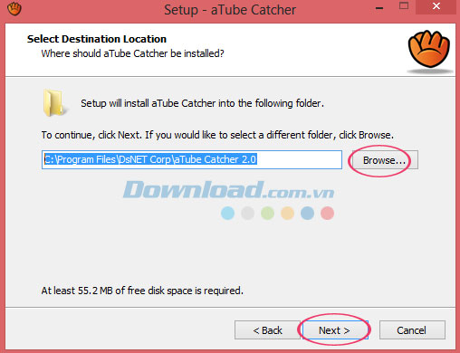 Bước tiếp theo, hãy lựa chọn vị trí để lưu lại file cài đặt aTube Catcher. Ngoài ra, bạn có thể chọn một thư mục khác nếu muốn bằng cách nhấn Browse. Thư mục mặc định sẽ là: C:\Program Files\DsNET Corp\aTube Catcher 2.0. Lưu ý: bạn cần ít nhất 55,2 MB không gian ổ đĩa trống. Sau đó, bấm Next để tiếp tục.