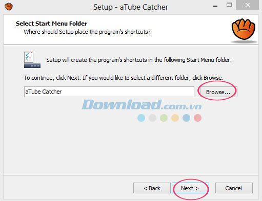 Kế tiếp, vui lòng chọn thư mục Start Menu để lưu lại các phím tắt sử dụng chương trình. Để tiếp tục, nhấn Next. Nếu muốn lựa chọn một thư mục khác, bấm Browse.