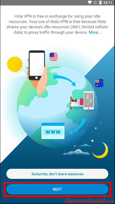 Sau khi cài đặt xong, hãy mở Hola lên sau đó nhấn Next.