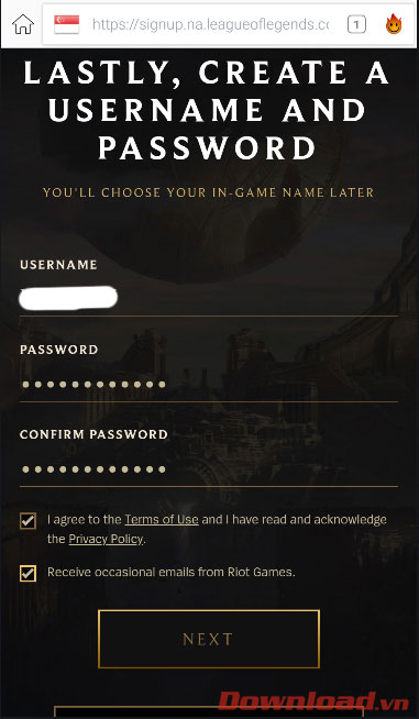 Cuối cùng là điền tên đăng nhập và mật khẩu, sau đó tích chọn vào dòng I agree to the Terms of Use... và nhấn Next để xác nhận việc tạo tài khoản.