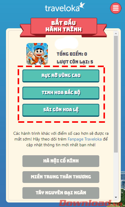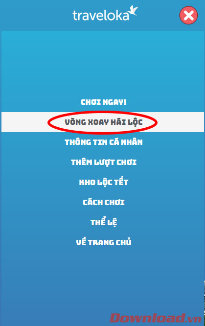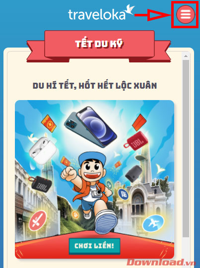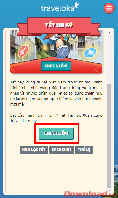 Đầu tiên các bạn mở ứng dụng traveloka và chọn phần game online Tết du ký ở màn hình của ứng dụng. Nếu dùng trình duyệt, hãy truy cập vào trang www.traveloka.com/vi-vn/tet-du-ky#home. Ở giao diện chính của game, hãy nhấn nút Chơi liền.