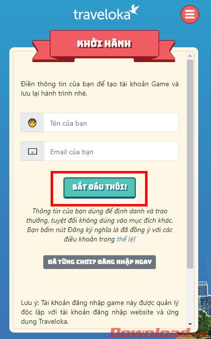 Nhập tên và Email của bạn (nếu bạn chơi lần đầu) sau đó nhấn nút Bắt đầu thôi. Nếu đã từng chơi, các bạn nhấn nút Đã từng chơi, đăng nhập ngay ở phía dưới sau đó đánh email đăng nhập vào là được.