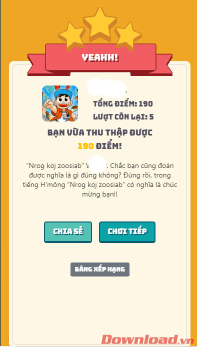 Sau khi đã vượt qua màn chơi, các bạn sẽ nhìn được điểm số mình vừa mới thu được.