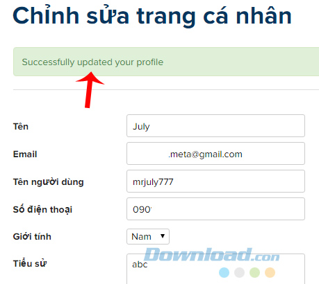Sau khi các thông tin được cập nhật và xác định đúng, sẽ có một thông báo như sau "Successfully update your profile"