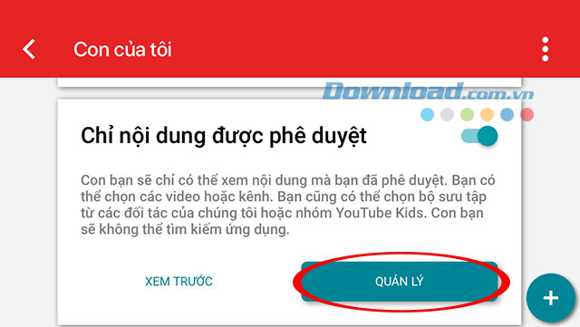 Hoặc nhấn Quản lý để thêm hoặc bỏ đi 1 số kênh đã chọn cho phép trẻ xem.
