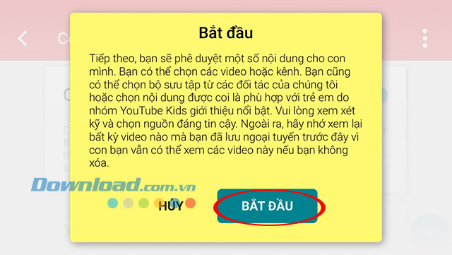 Ngay sau đó là cửa sổ thông báo Bắt đầu phê duyệt nội dung cho con mình, nhấn Bắt đầu để tiếp tục.