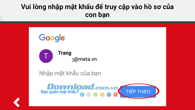 Chọn đến người con mà bạn muốn thiết lập kênh xem. Lúc này chúng ta sẽ phải nhập mật khẩu của tài khoản cha mẹ đăng ký ban đầu. Nhập xong nhấn Tiếp theo.