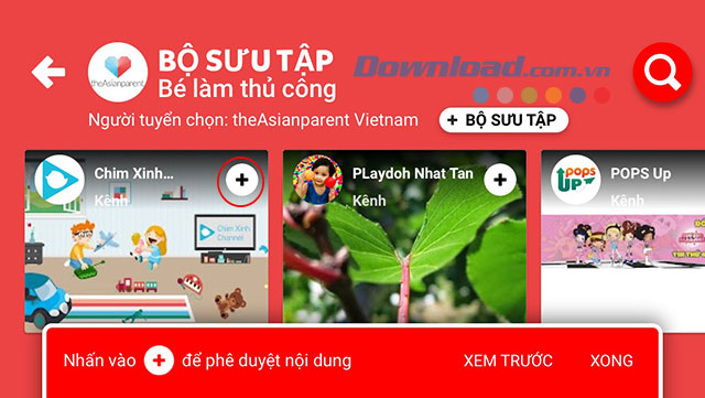 Phía trong Bộ sưu tâp sẽ có các kênh Youtube được sắp xếp theo số người dùng đã chọn với nhiều chủ đề khác nhau, hãy chạm vào để xem chi tiết kênh. Để thêm 1 kênh bạn chỉ cần nhấn chọn vào Dấu cộng.