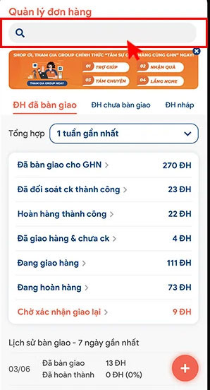 Sau khi cài đặt, các bạn hãy vào ứng dụng và đăng nhập. Ở màn hình chính, nhấn chọn phần tìm kiếm ở trên cùng sau đó nhập mã đơn hàng vào và chọn đơn hàng muốn xem.