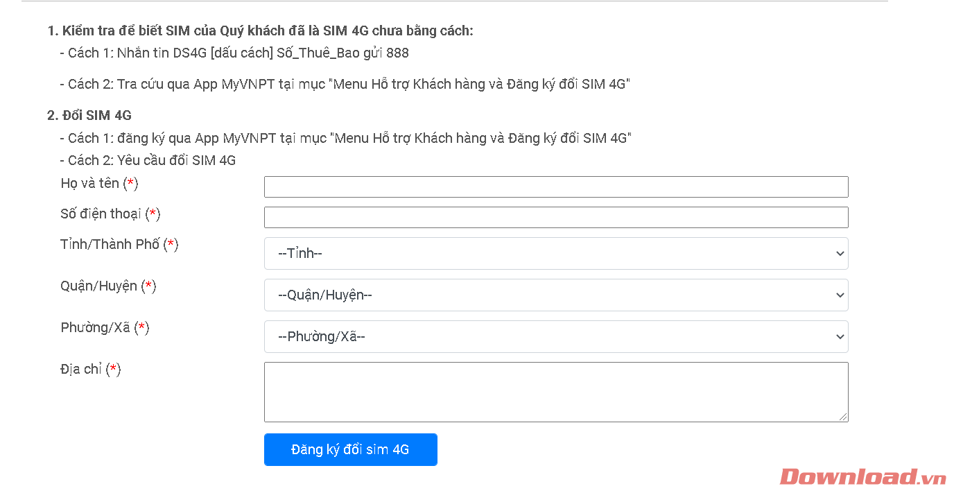 - Tiếp theo hãy điền đầy đủ thông tin như Họ tên, SĐT, Địa chỉ... vào phần ĐỔI SIM 4G sau đó nhấn nút Đăng ký đổi sim 4G.