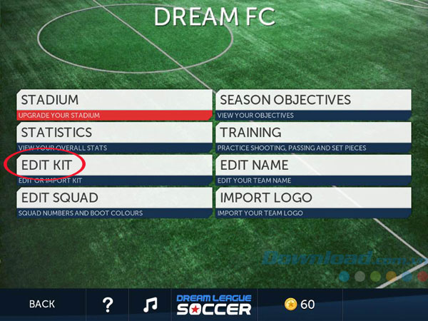 Từ màn hình thực đơn chính của Dream League Soccer, nhấn chọn My Club - nơi bạn có thể nâng cấp sân vận động, xem các số liệu thống kê, tùy biến đội bóng, xem các mục tiêu mùa giải, huấn luyện cầu thủ, thay đổi tên và nhập logo câu lạc bộ. Tuy nhiên, trong khuôn khổ bài viết này, chúng ta chỉ quan tâm tới tính năng tùy biến Kit trong mục My Club.