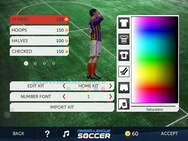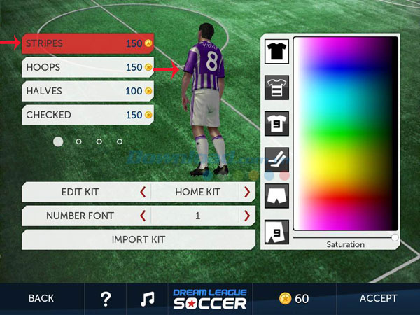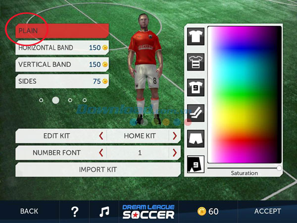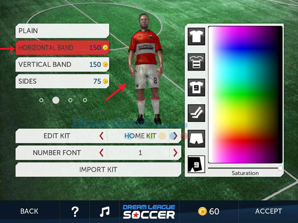 Phía bên phải màn hình Edit Kit là bảng điều chỉnh độ bão hòa của màu sắc trang phục. Tại đây bạn có thể chọn màu sắc và điều chỉnh độ bão hòa cho các loại áo, quần và tất thi đấu. Nhấn vào từng tùy chọn bên trái bảng màu để chọn lần lượt áo trơn, áo kẻ, số áo, tất, quần trơn và màu số trên quần thi đấu. Chọn màu sắc trong bảng màu và sử dụng thanh trượt để điều chỉnh độ bão hòa (Saturation) để có bộ trang phục đẹp nhất cho cầu thủ. Lưu ý, độ bão hòa càng cao thì màu sắc của trang phục càng "sạch" và rõ nét.