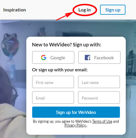 Đầu tiên các bạn truy cập vào trang https://www.wevideo.com/. Ở góc trên bên phải, các bạn nhấn nút Log in.