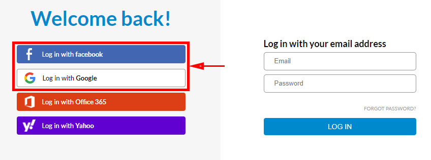 Ở phần đăng nhập bên trái, các bạn nhấn chọn Log in with facebook hoặc Log in with Google để đăng nhập bằng tài khoản facebook hoặc google.