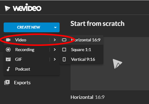 Nhấn tiếp nút CREATE NEW sau đó nhấn chọn tiếp nút Video và chọn tỉ lệ khung hình của video.