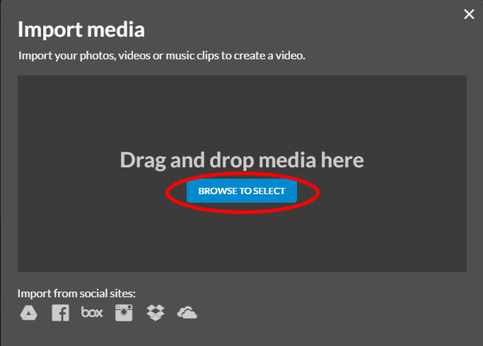 Nhấn giữ và kéo video cần chỉnh sửa vào ô Import media hoặc nhấn nút Browse to select và chọn file video.