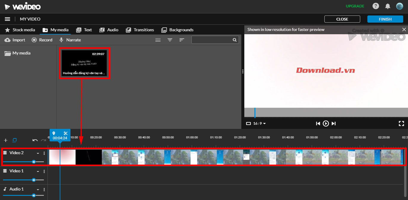Sau khi kết thúc việc biên tập video, các bạn nhấn chọn nút Finish ở góc trên bên phải.