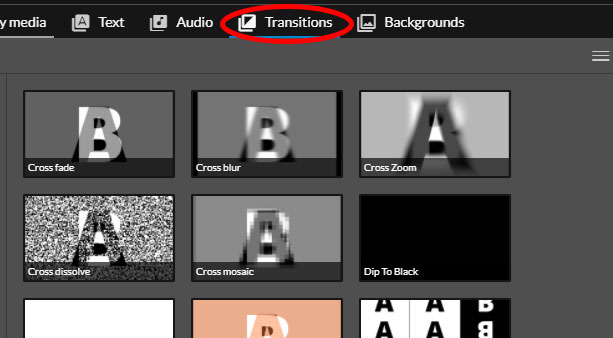 Nhấn chọn phần Transitions để tạo hiệu ứng xuất hiện, kết thúc và chuyển cảnh cho video.
