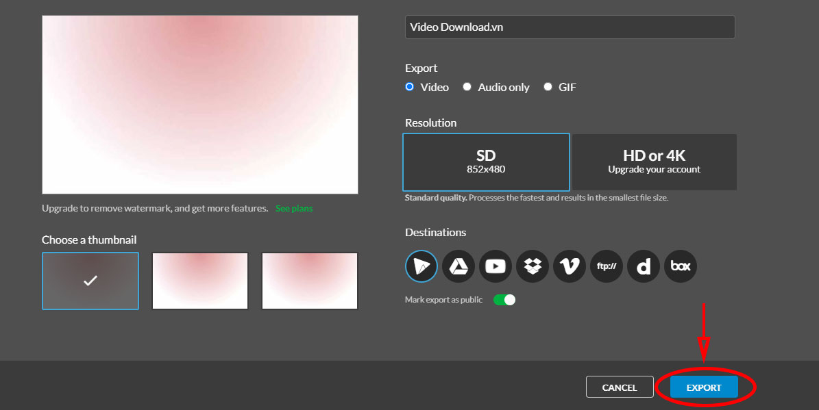 Chọn độ phân giải muốn xuất video (nếu chọn HD or 4K các bạn sẽ cần nâng cấp lên tài khoản trả phí). Cuối cùng hãy nhấn nút EXPORT để xuất video.