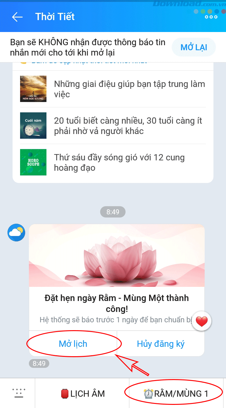 Ngoài ra, Zalo còn có thêm một tính năng rất thú vị khác đó là nhắc Rằm/Ngày mùng 1. Để kích hoạt chức năng này, các bạn hãy trở lại phần thời tiết và nhấn vào RẰM/MÙNG 1. Ứng dụng sẽ hiện lên thông báo Đặt hẹn ngày Rằm - Mùng 1 thành công. Khi đến những ngày này, ứng dụng sẽ tự động gửi thông báo cho bạn trước một ngày để chuẩn bị. Nếu muốn xem thêm về các ngày lễ, tết các bạn nhấn vào Mở Lịch.