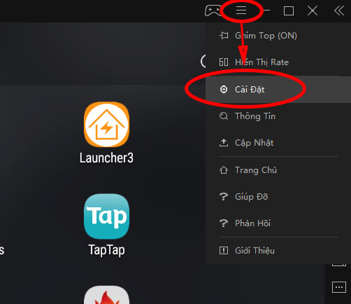Bước đầu tiên ta cần phải bật tính năng cho phép Root cho giả lập bằng cách nhấn vào nút hình 3 gạch ở góc trên bên phải màn hình sau đó chọn Cài đặt như hình dưới.