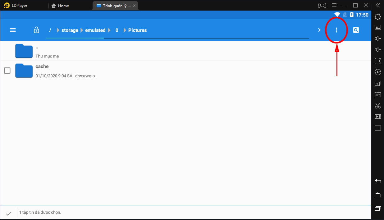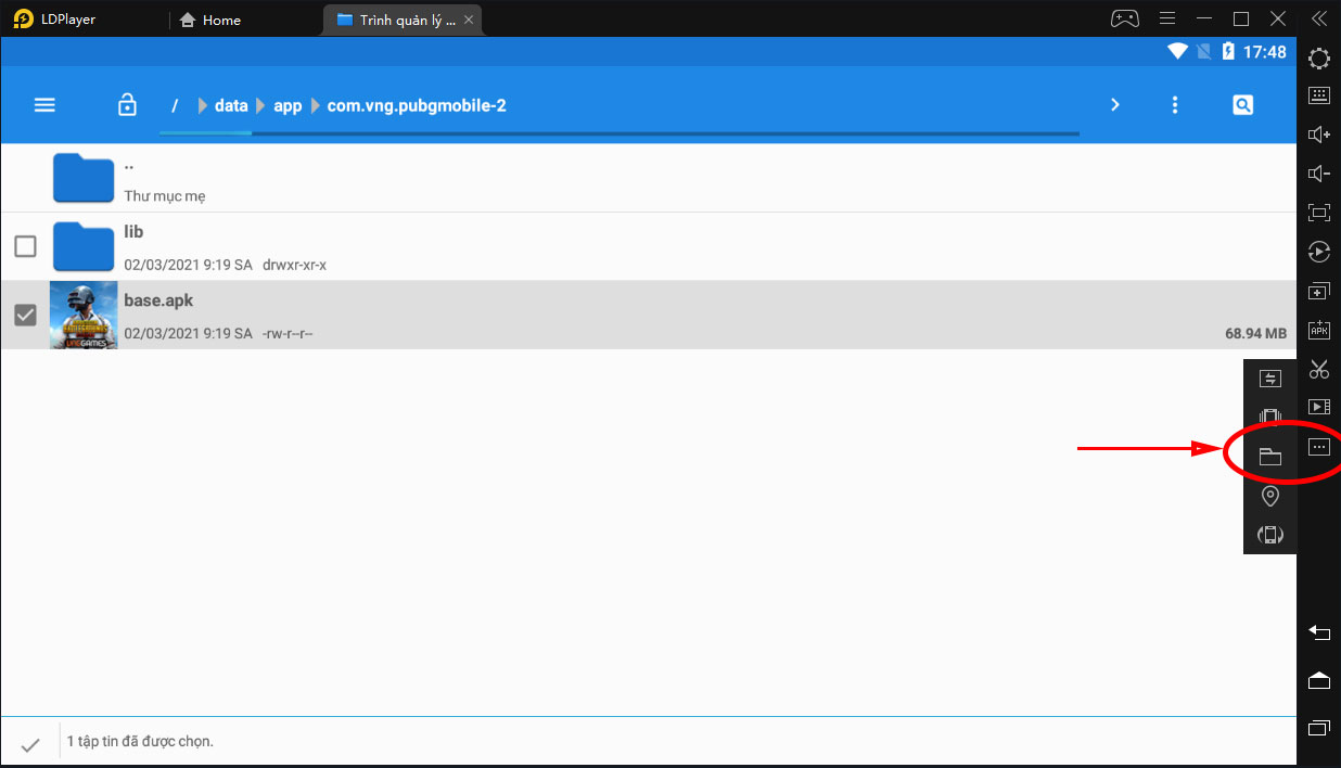 Để chuyển file apk vừa chọn hãy nhấn nút có hình ... ở cạnh bên phải giả lập sau đó chọn nút hình thư mục.