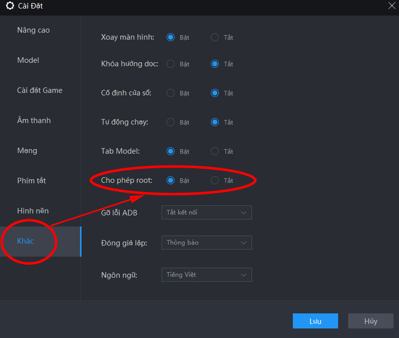 Chọn tiếp tab Khác -> Bật Cho phép root sau đó nhấn Lưu.
