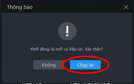 Hệ thống sẽ hiển thị hộp thoại yêu cầu bạn khởi động lại giả lập mới có tác dụng, nhấn chọn nút Chạy lại.