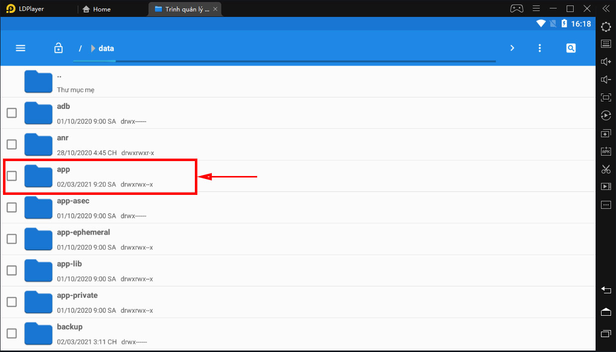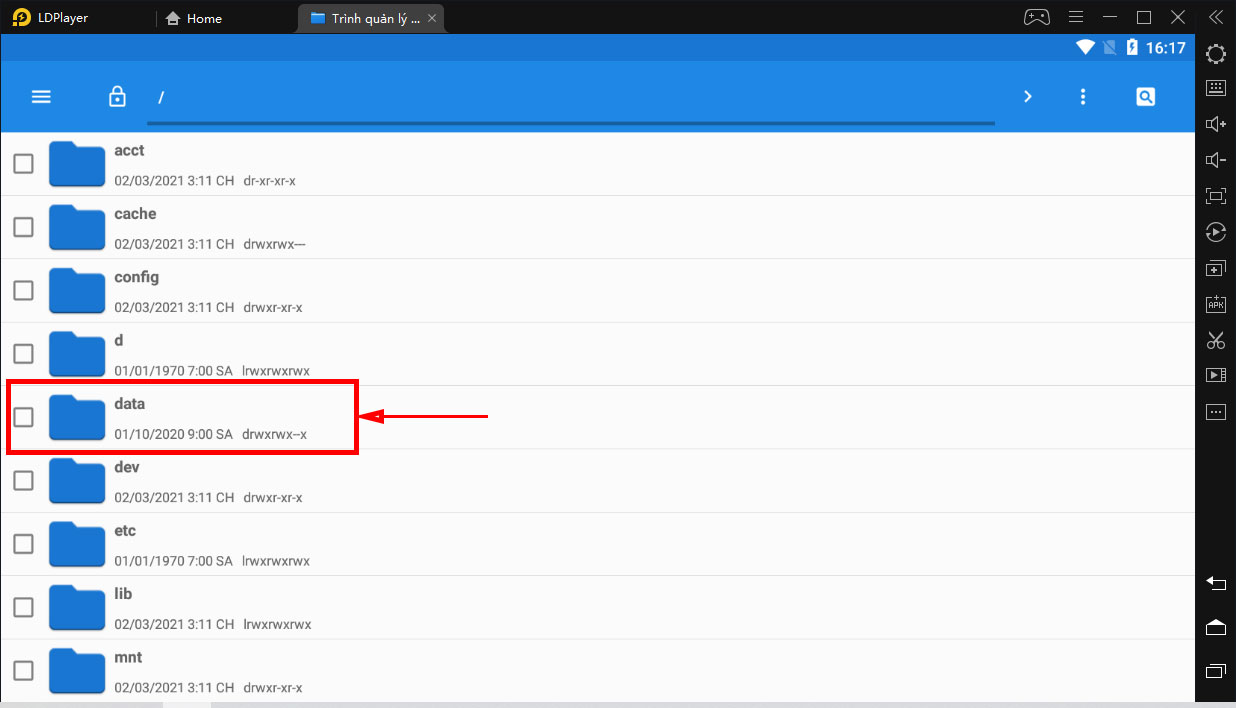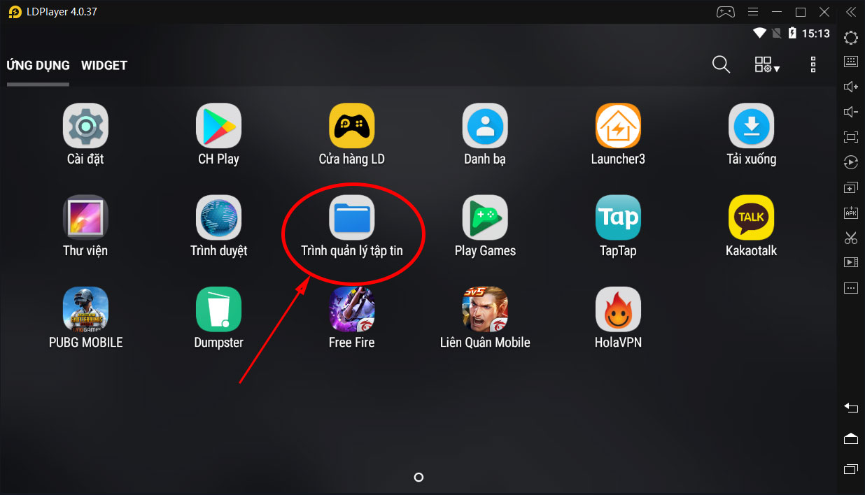 Sau khi đã hoàn thành việc bật root máy, các bạn quay trở lại màn hình chính của LDPlayer và chọn Trình quản lý tập tin.