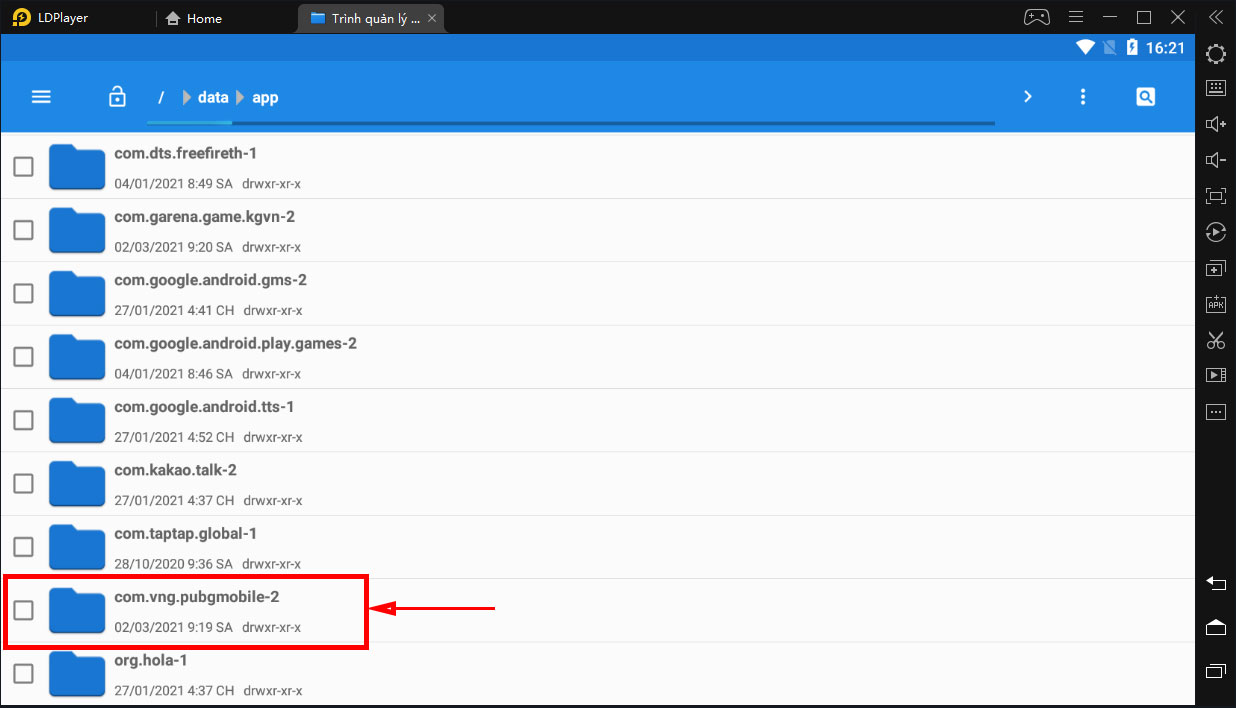 Lúc này, hãy nhìn tên của các thư mục hiện ra để tìm đến ứng dụng hoặc game cần lấy file apk. Ví dụ như hình dưới là thư mục PUBG Mobile.