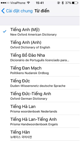 Chọn vào Settings - Cài đặt / General - Cài đặt chung / Dictionary - Từ điển và lựa chọn những ngôn ngữ muốn sử dụng. Nếu chưa có sẵn, các bạn có thể tải về máy một cách đơn giản và nhanh chóng.
