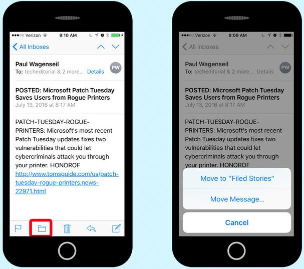 Và iOS 10 cung cấp cho bạn một sự lựa chọn tuyệt vời, đó là gộp chung tất cả những email có liên quan tới nhau vào chung một thư mục. Cách sử dụng cũng rất đơn giản, chỉ cần chạm vào biểu tượng thư mục ở Menu dưới cùng, một số gợi ý để gộp mail sẽ được liệt kê cho các bạn. Sau khi thực hiện bước đầu, các mail sau muốn chuyển vào chỉ cần chọn "Move to <tên thư mục>" hoặc Move Message...