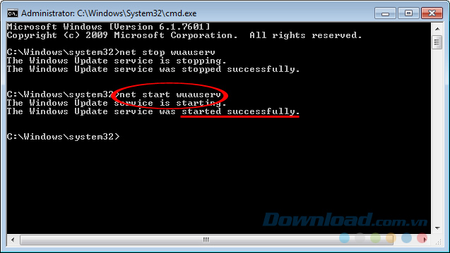 Bước 6: Quay trở lại cửa sổ lệnh cmd, nhập thêm lệnh: net start WuAuServ vào và chờ chút xíu.