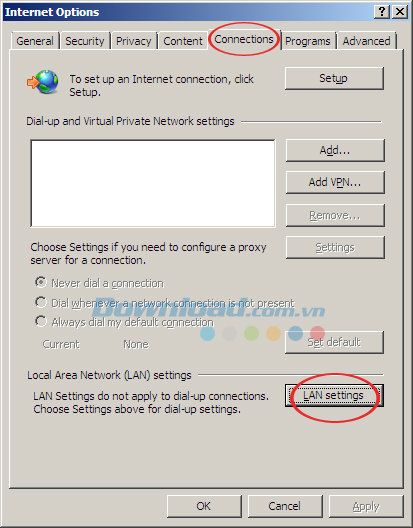 Bước 2: Cửa sổ Internet Options xuất hiện. Nhấn vào thẻ Connections, kéo xuống nhấn vào nút LAN settingstrong mục Local Area Network (LAN) settings.