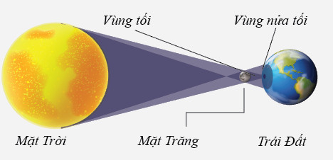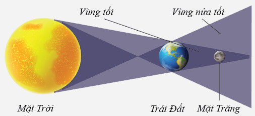 Tương tự như vậy, hiện tượng nguyệt thực là hiện tượng khi Mặt Trăng đi vào vùng tối do Trái Đất tạo ra (hình 12.8b). Khi đó, ở một số nơi trên Trái Đất, người ta sẽ thấy Mặt Trăng bị Trái Đất che khuất.