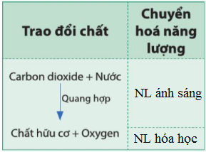 Bảng 18.1.Mối quan hệ giữa trao đổi chất và chuyển hoá năng lượng trong quá trình quang hợp ở tế bào là cây.