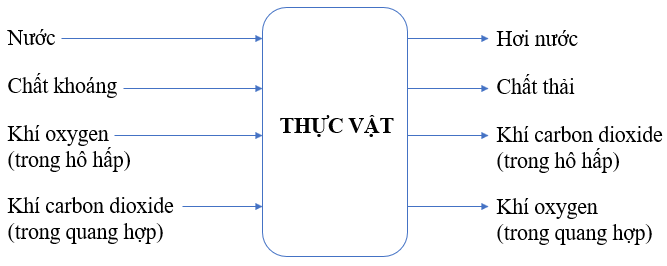 a. Nước b. Chất thải c. Chất khoáng d. Khí oxygen e. Khí carbon dioxide g. Vitamin h. Chất hữu cơ i. Năng lượng ánh sáng.