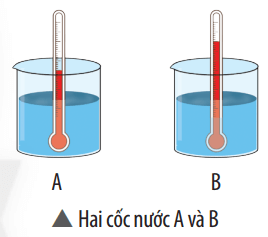 Nước trong hai cốc A và B có thể tích bằng nhau và nhiệt độ được biểu thị bởi nhiệt kế trong hình bên.