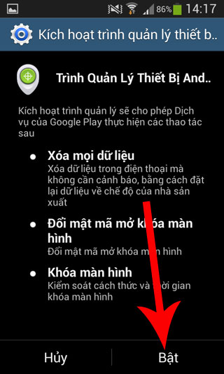 Trong phần quản lý thiết bị chạm vào Trình quản lý thiết bị > chọn cho phép Trình Quản Lý Thiết bị Android khóa hoặc xóa nội dung trên thiết bị đã mất > Chọn Bật.