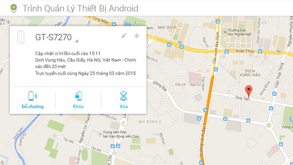 Từ bây giờ, nếu trong trường hợp không rõ điện thoại của bạn ở đâu bạn có thể truy cập vào địa chỉ Google.com.vn/Android/devicemanager để xác định vị trí máy tại thời điểm hiện tại. Bạn cần đăng nhập địa chỉ Email và mật khẩu, ngay sau đó bạn có thể xác định vị trí của điện thoại.