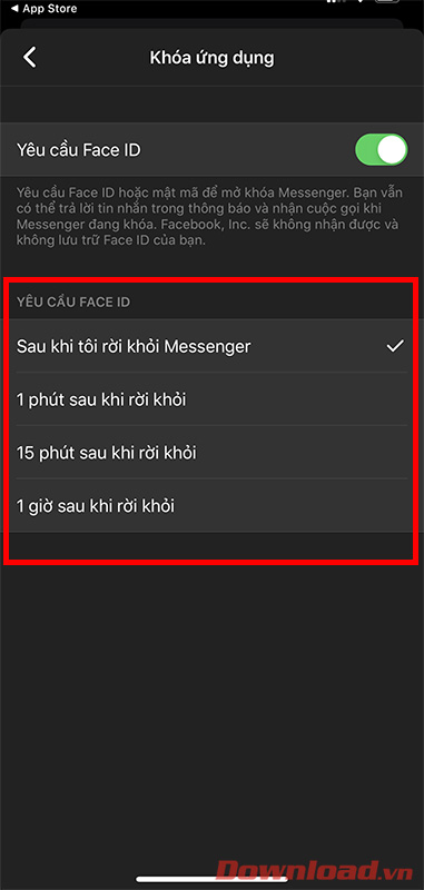 Bước 6: Sau khi bật chức năng khóa, bạn sẽ thấy ở phía dưới hiện ra một số tùy chọn thời gian khóa ở phần Yêu cầu Face ID hoặc Touch ID. Thông thường nếu không dùng thường xuyên hãy để khóa ngay sau khi rời khỏi Messenger.