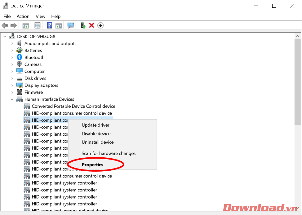 Trong cửa sổ Device Manager, các bạn tìm đến phần Human Interface Devices và click chuột phải vào bất cứ mục nào trong phần này sau đó chọn Properties.