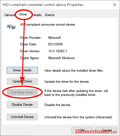 Trong hộp thoại Properties, chọn tiếp tab Driver sau đó click vào Roll Back Driver.