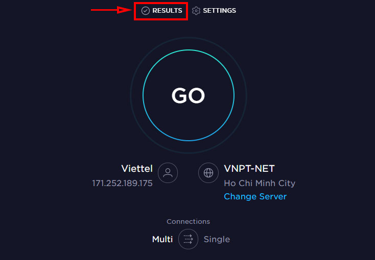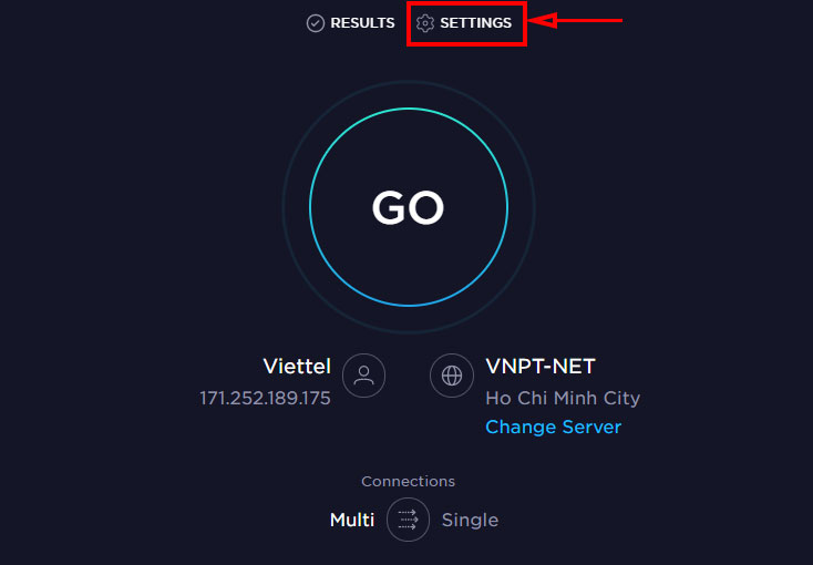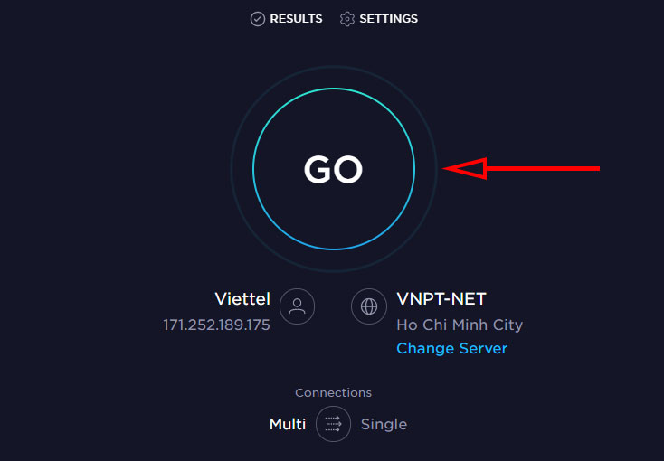 Để kiểm tra tốc độ mạng với SpeedTest, đầu tiên các bạn truy cập vào trang web của SpeedTest. Ở màn hình chính, nhấn nút GO để kiểm tra tốc độ mạng ngay lập tức. Sẽ mất một khoảng thời gian để SpeedTest kiểm tra tốc độ mạng và cho ra kết quả.