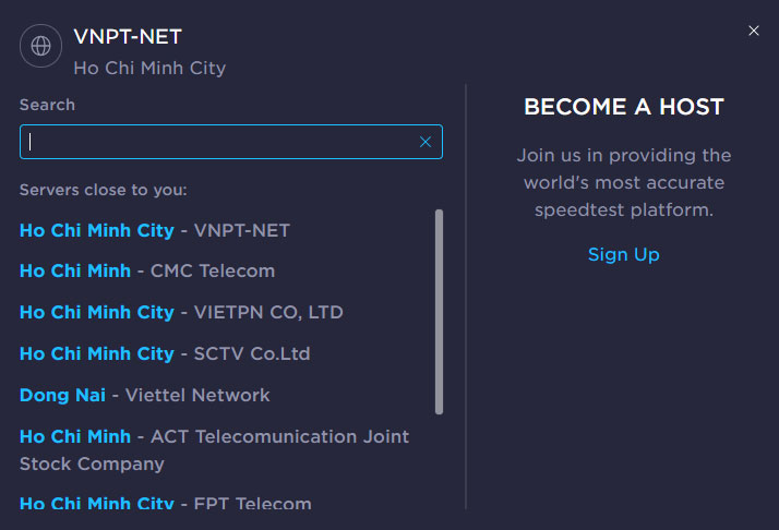 Trong danh sách các máy chủ hiện ra, các bạn hãy chọn lấy một máy chủ muốn sử dụng. Thường nếu như muốn kiểm tra tốc độ mạng thì nên chọn các máy chủ ở gần địa điểm của bạn để cho ra kết quả chính xác nhất.
