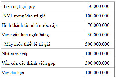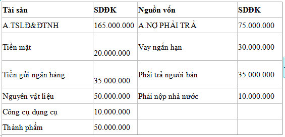 VD: Phân biệt tài sản và nguồn vốn cho một cho một doanh nghiệp theo các thông tin sau (Lập bảng cân đối kế toán):