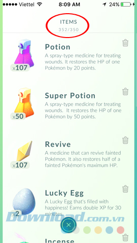 Nếu vào trong Items, các bạn sẽ thấy ngay bên trên sẽ hiển thị số lượng vật phẩm đang có và số lượng vị trí mà túi đồ có thể lưu được (theo mặc định là 350 chỗ). Khi full đồ, Pokemon Go sẽ không có thống báo, cách duy nhất phát hiện được khi nếu người chơi nhận được thêm đồ, thì nó sẽ không vào túi hoặc nếu đang quay thưởng trong Pokestop, sẽ bị báo lỗi "Try Again Later".